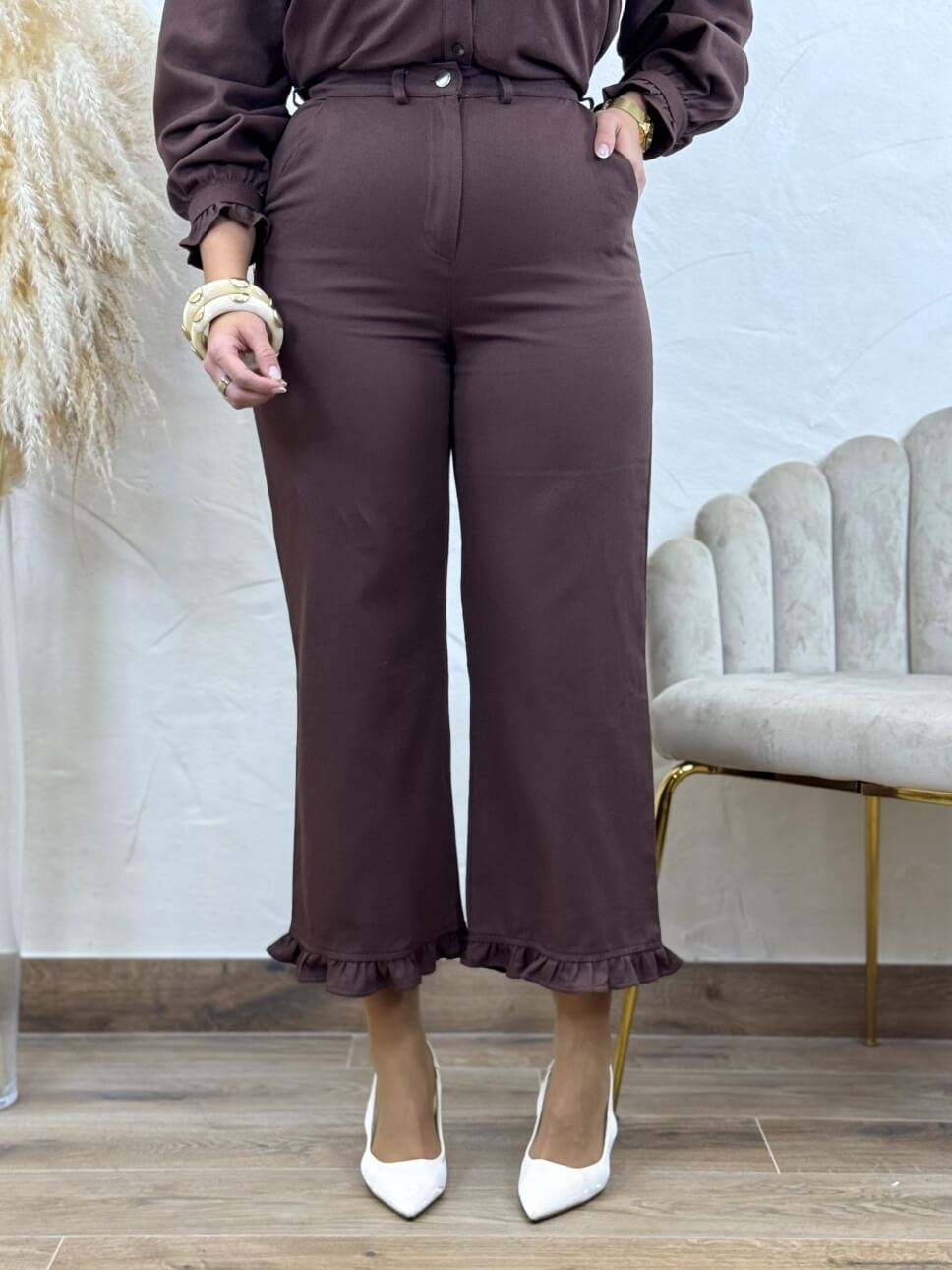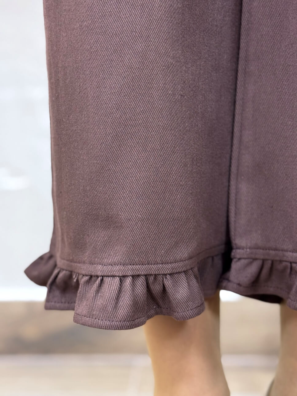 Pantalón tejido de loneta con bolsillos delanteros, cierre de botones y cremallera y volante en la parte baja del pantalón.