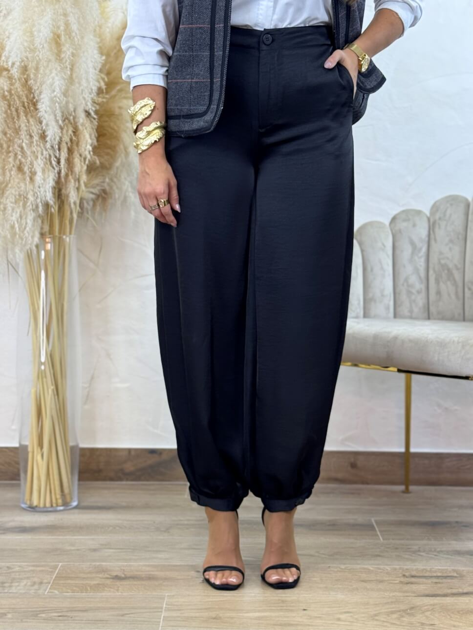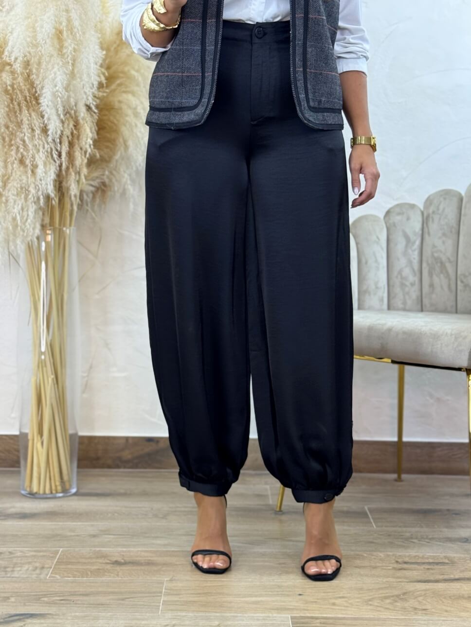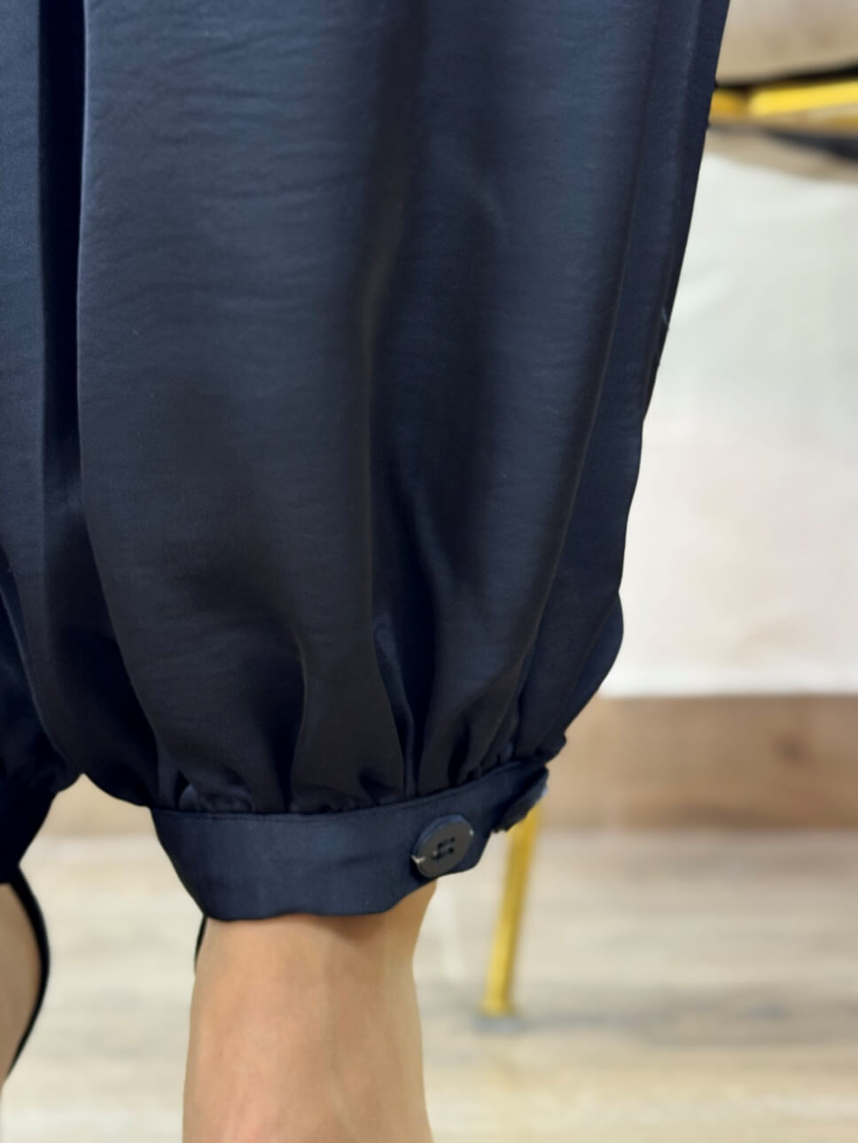 Pantalón bombacho tejido de satén con bolsillos laterales, goma en la parte trasera de la cintura, cierre de botón y cremallera. Puño en la parte baja con doble botón.