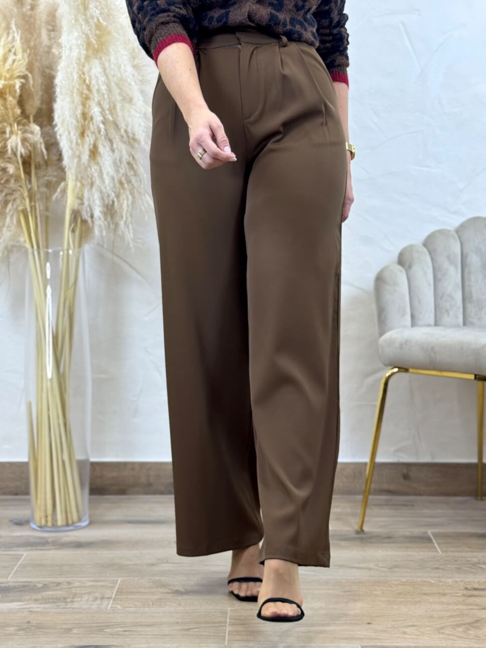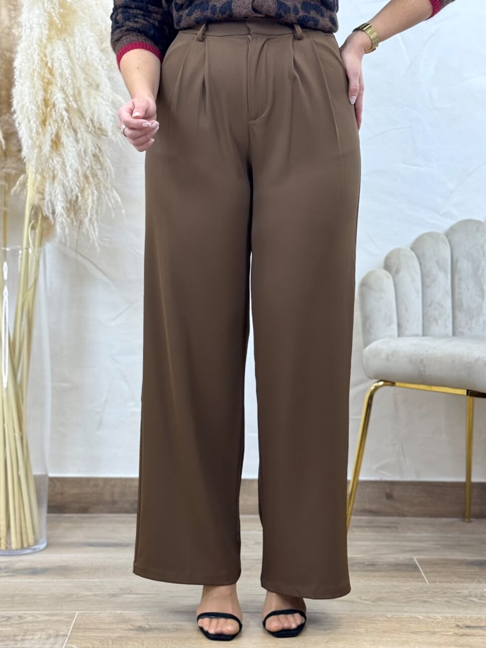 Pantalón de vestir pata ancha fluido con pinzas, bolsillos laterales y cierre de botón y cremallera.