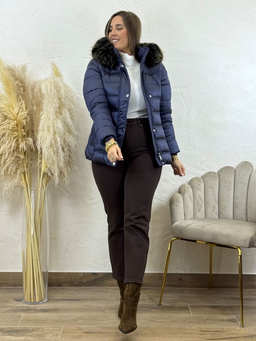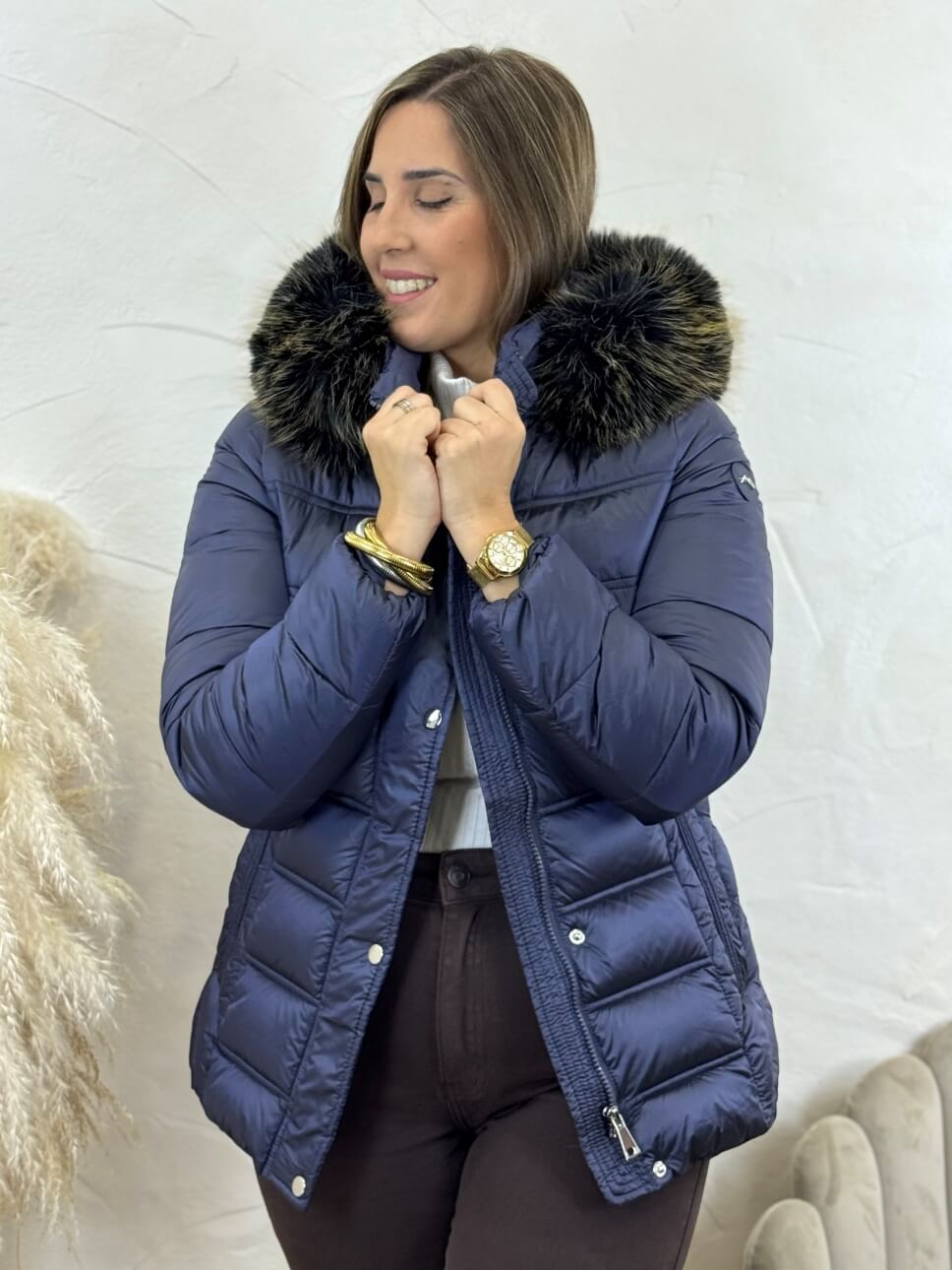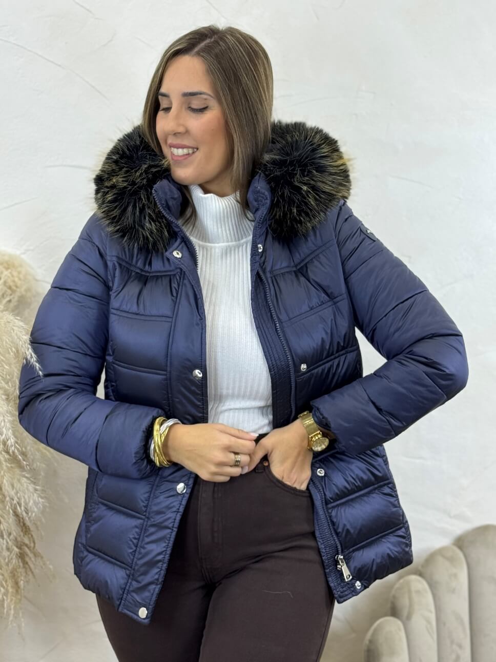Plumi de la colección Snow con pelo bicolor desmontable con corchetes. Capucha desmontable con cremallera. Bolsillos laterales con corchete. Pelo natural.