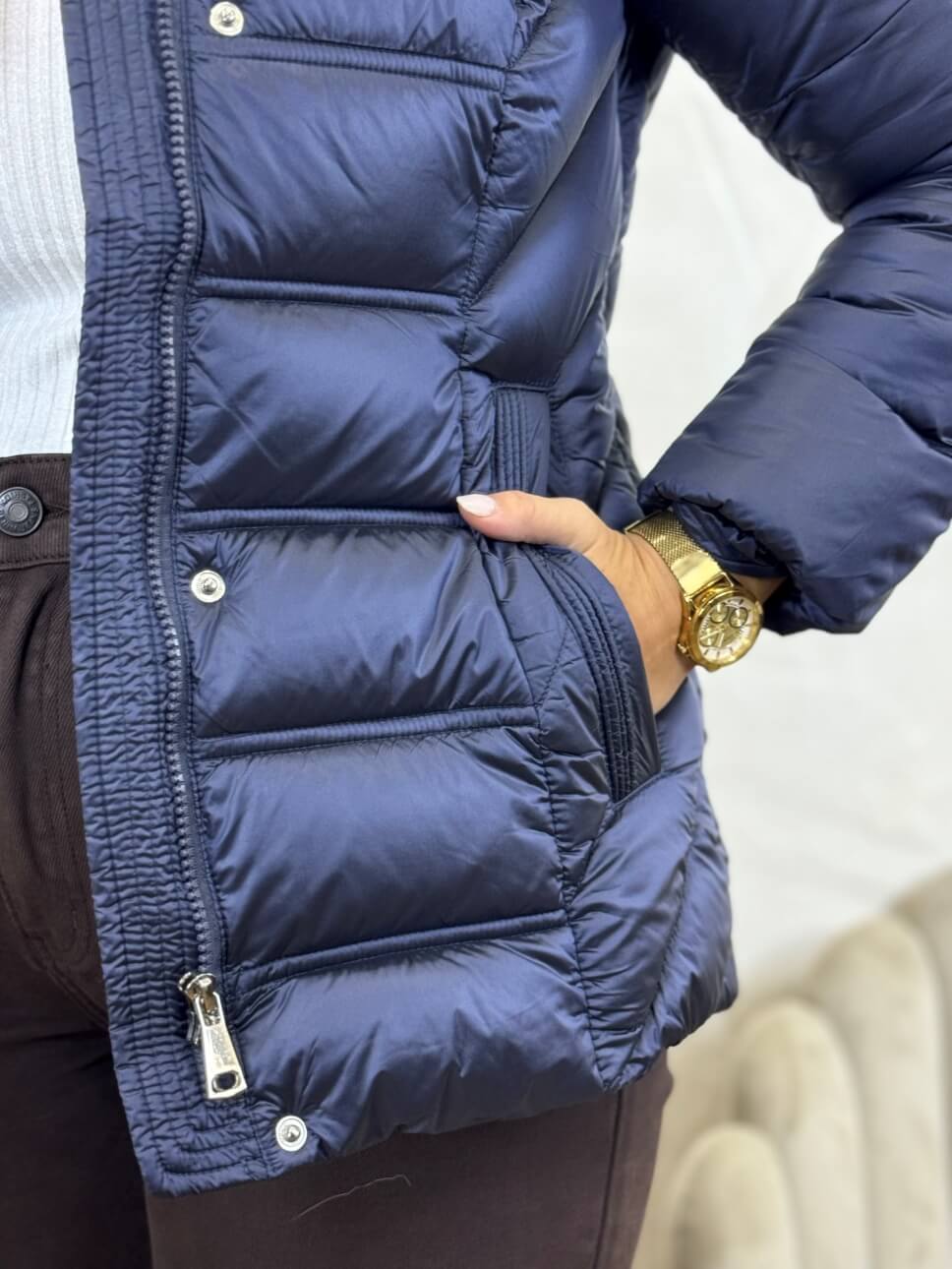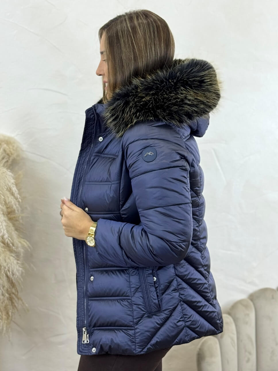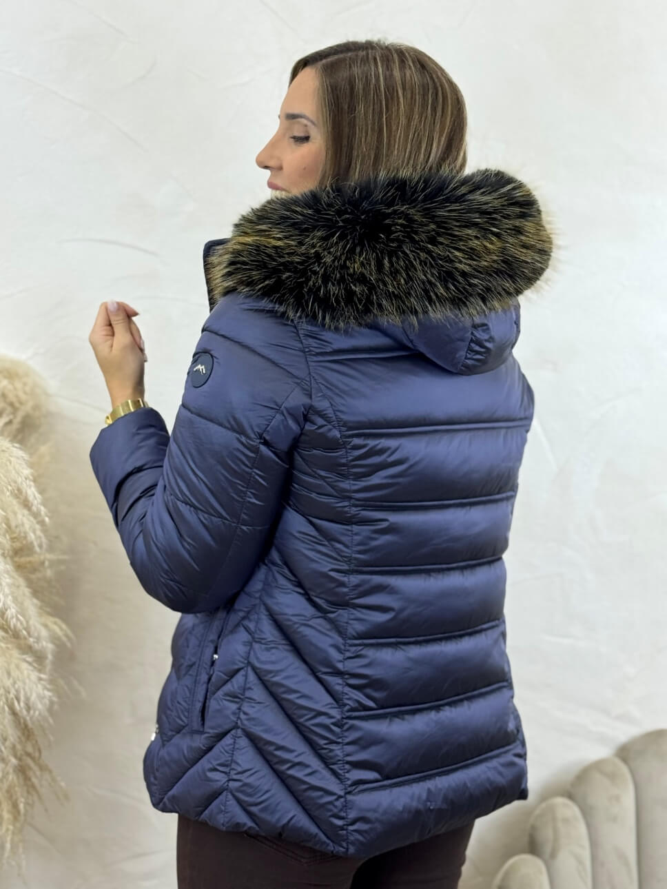 Plumi de la colección Snow con pelo bicolor desmontable con corchetes. Capucha desmontable con cremallera. Bolsillos laterales con corchete. Pelo natural.