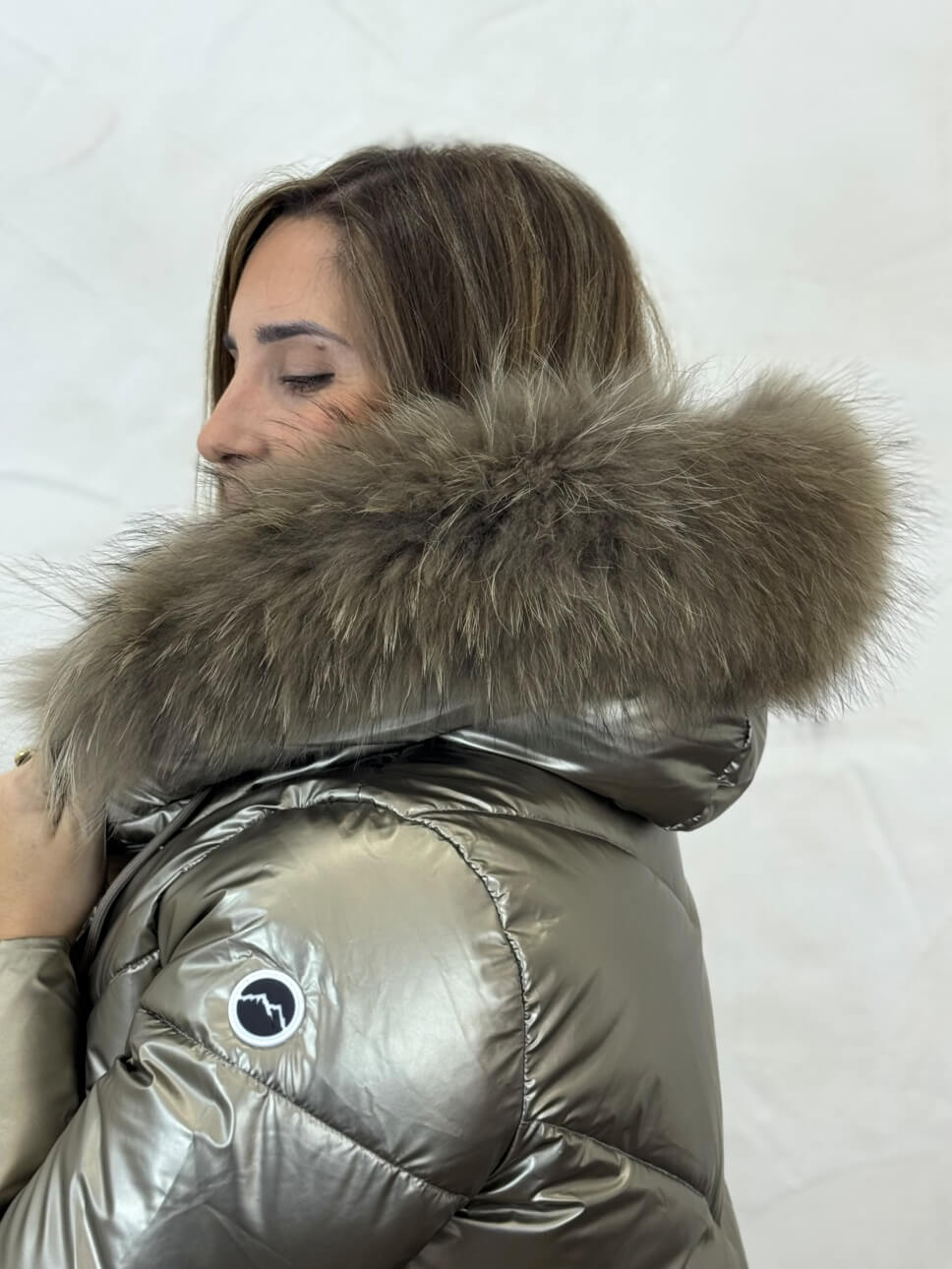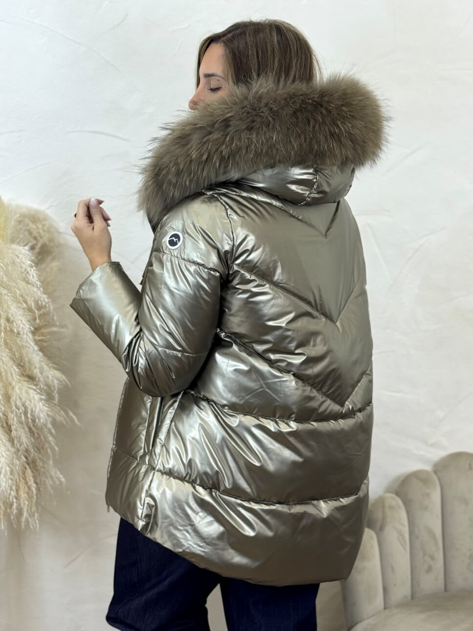 Plumi metalizado de la colección Snow con cierre de cremallera, bolsillos laterales con cremallera, capucha no desmontable, con pelo natural desmontable.