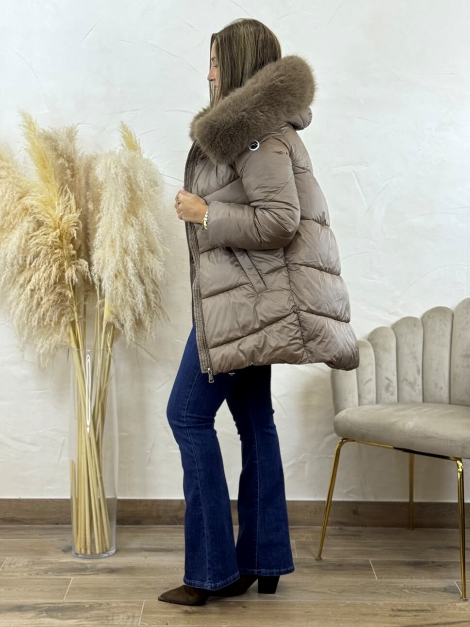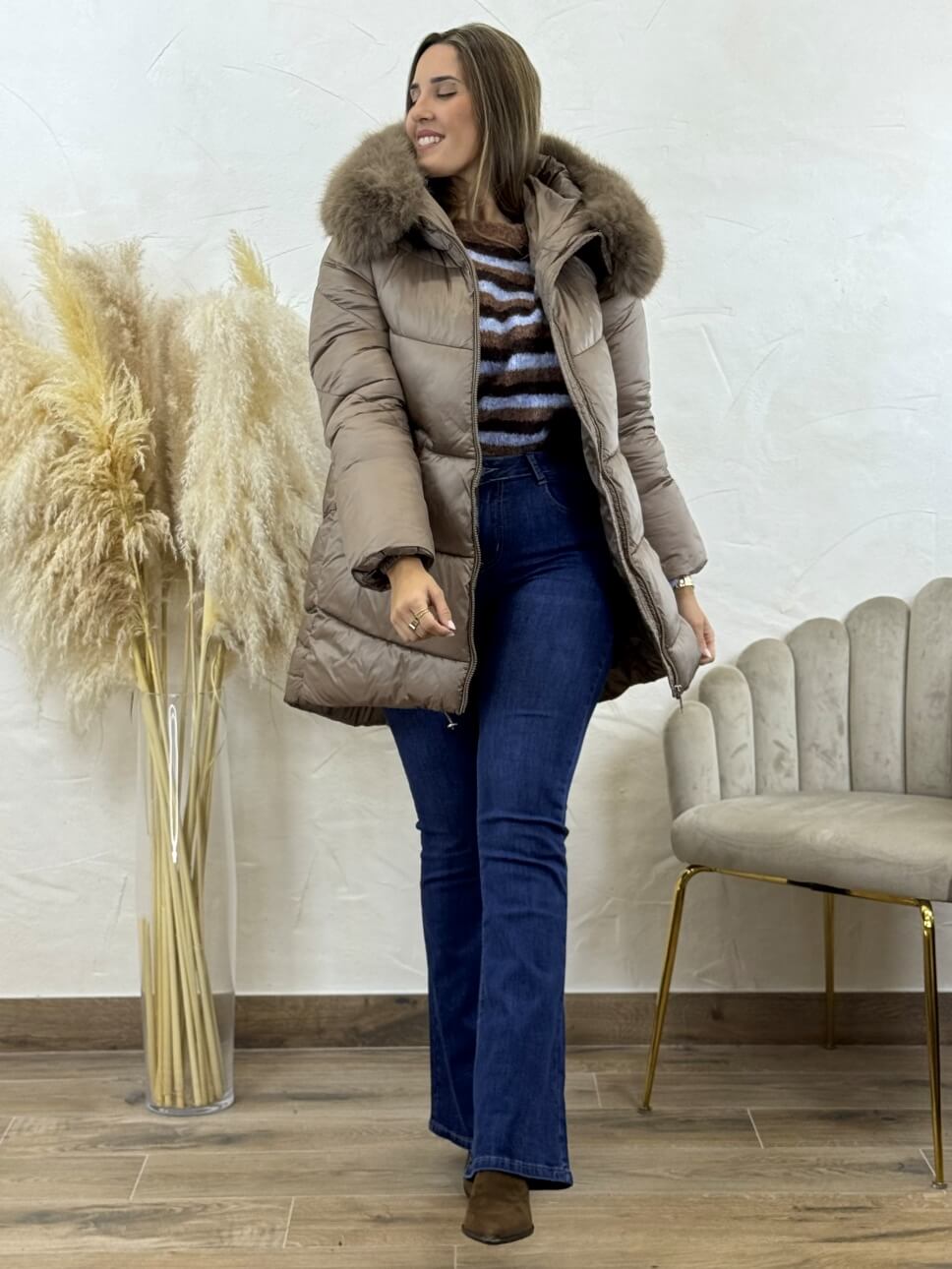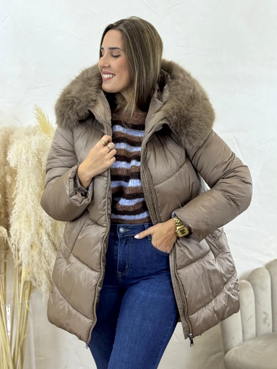 Plumi de la colección Snow con capucha, pelo desmontable, bolsillos laterales con cremallera y cierre de cremallera.
