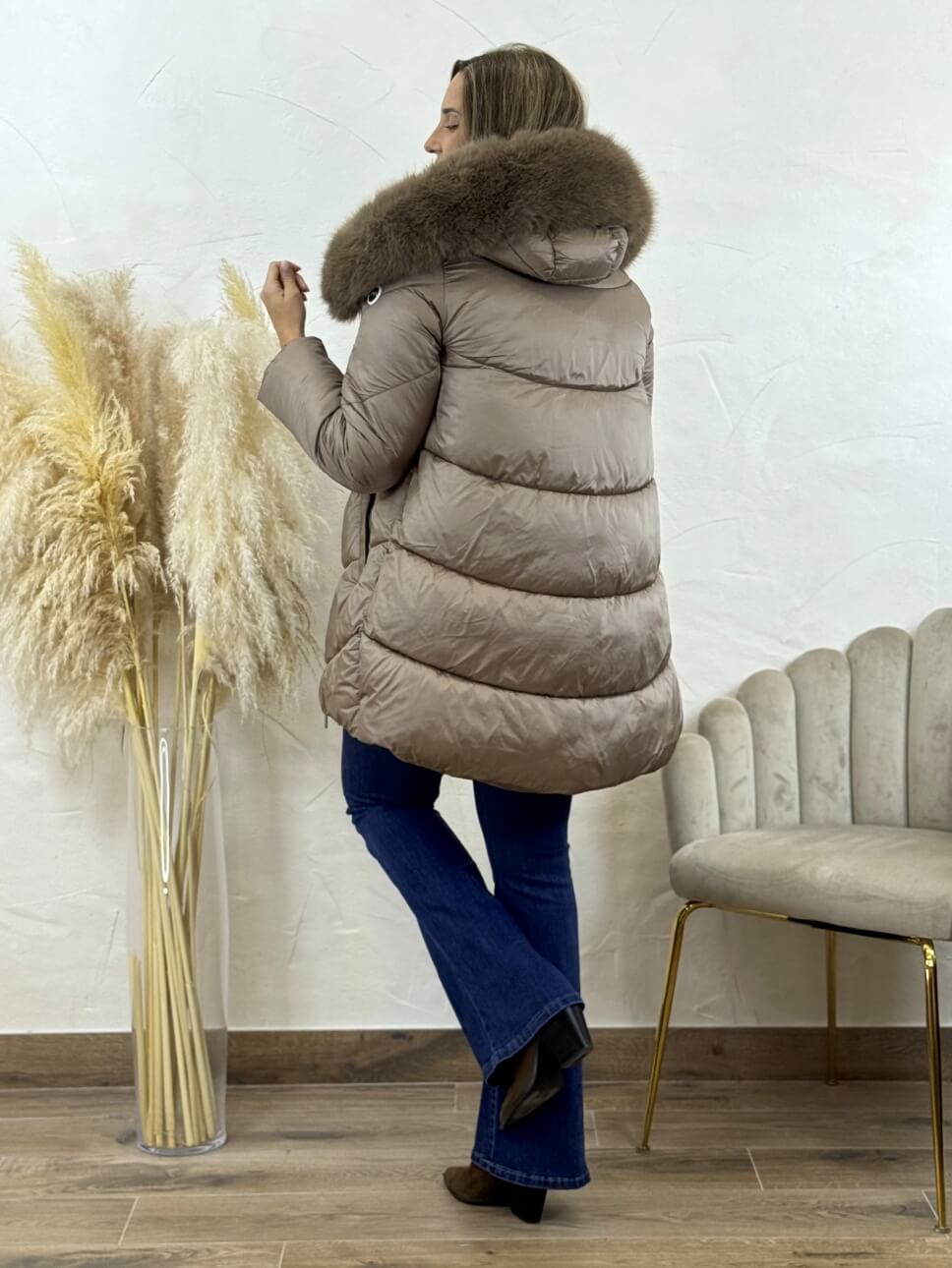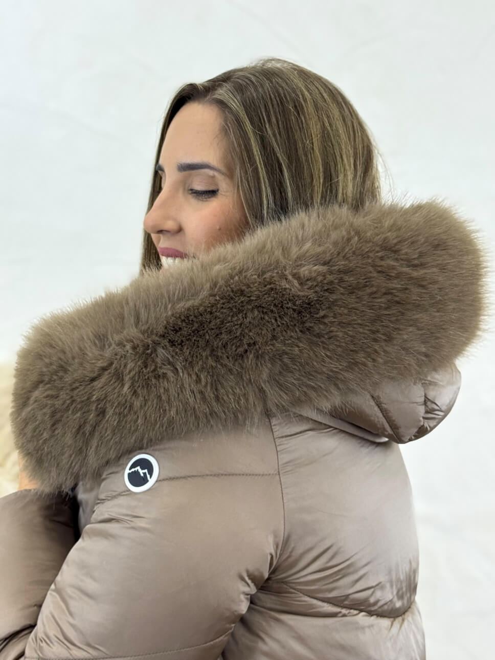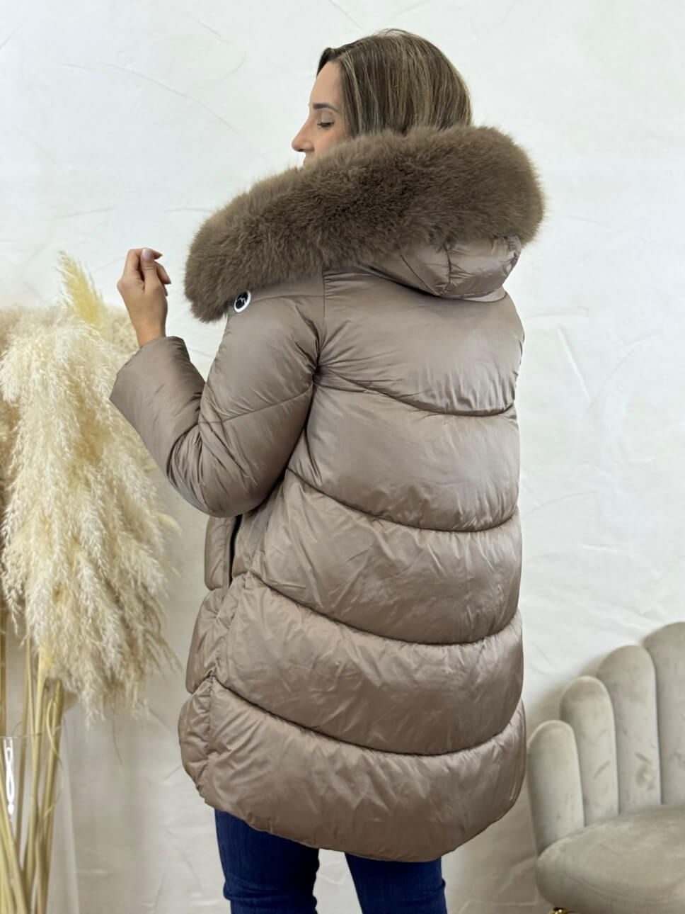 Plumi de la colección Snow con capucha, pelo desmontable, bolsillos laterales con cremallera y cierre de cremallera.