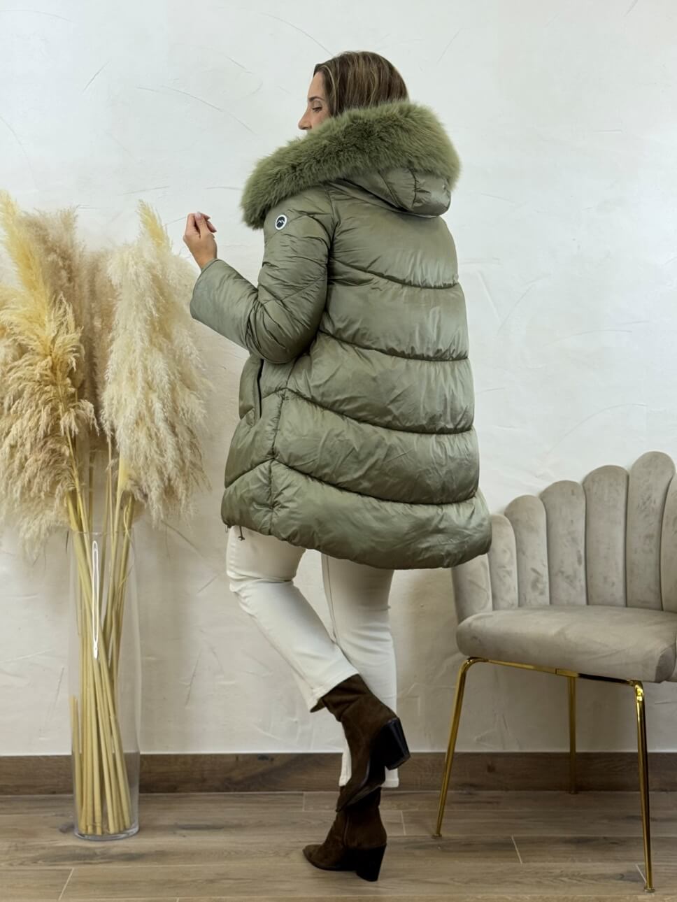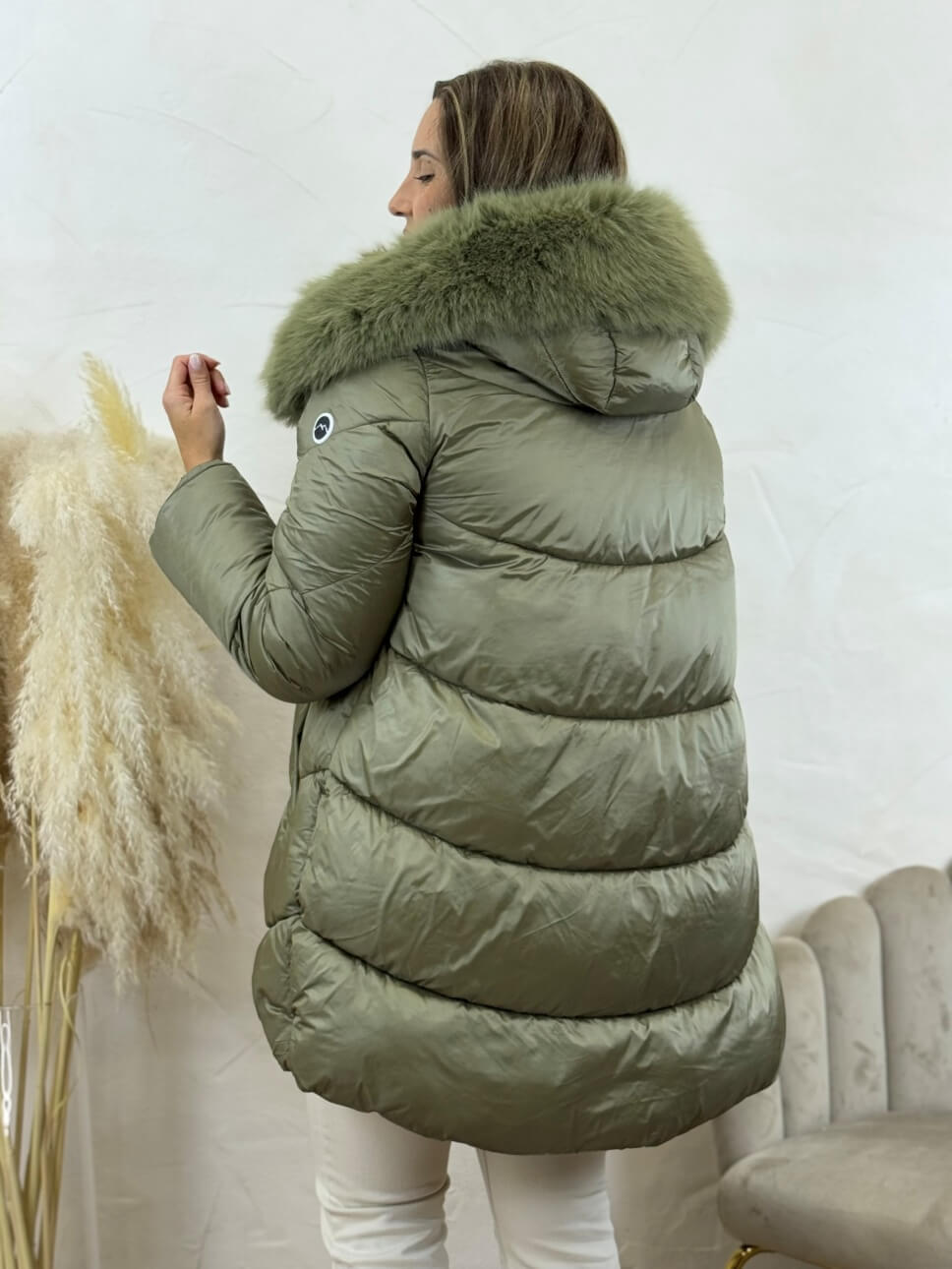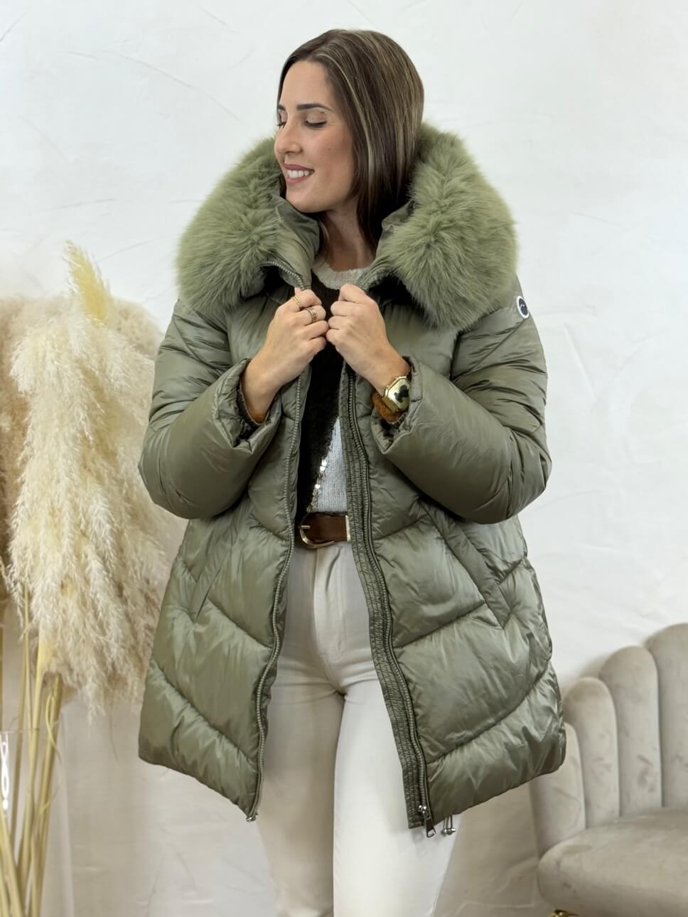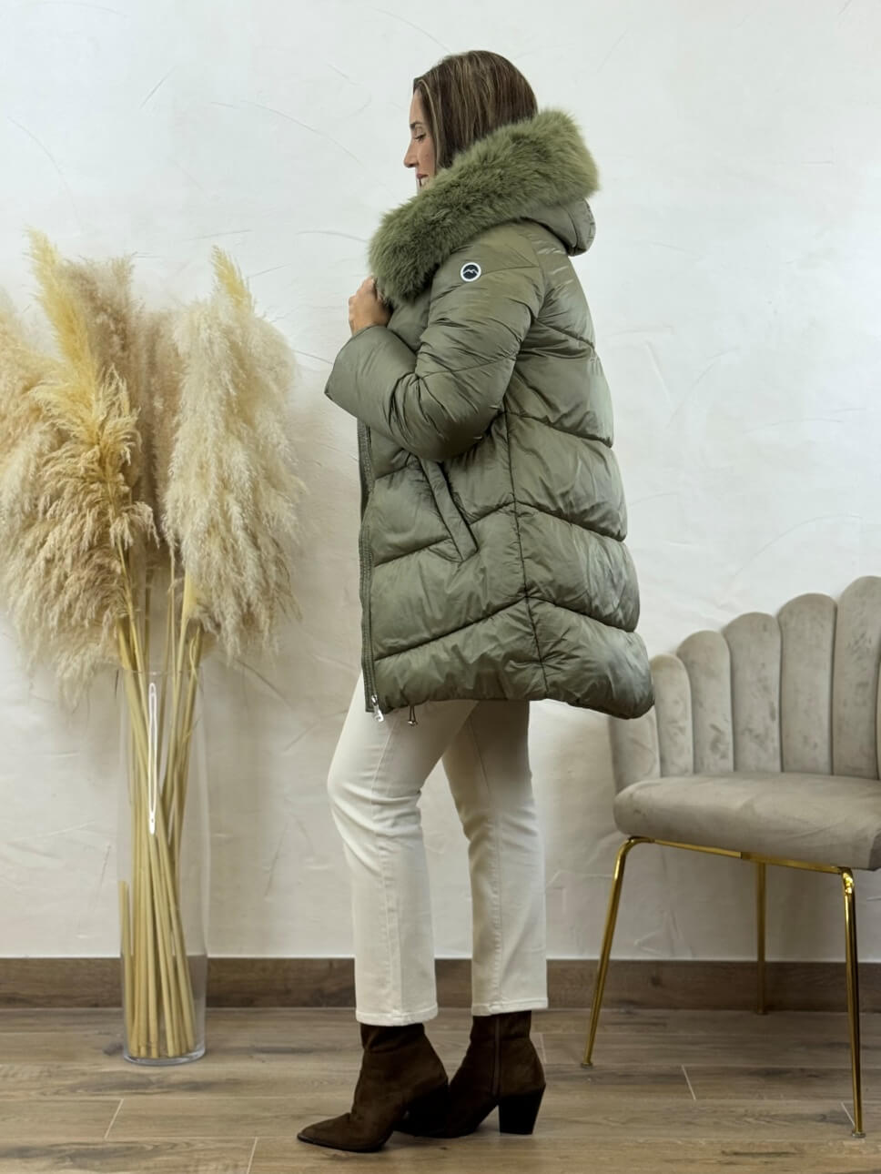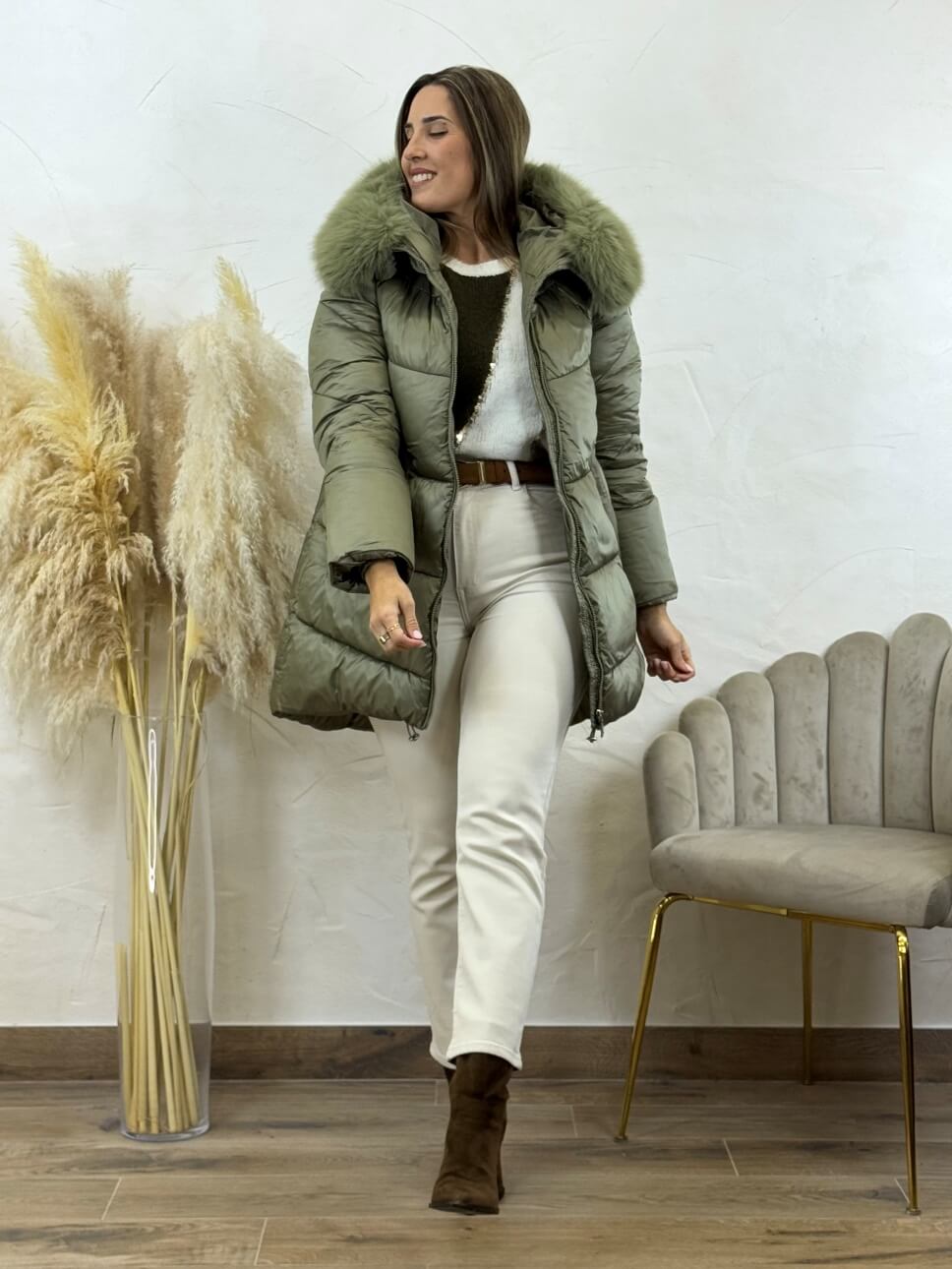 Plumi de la colección Snow con capucha, pelo desmontable, bolsillos laterales con cremallera y cierre de cremallera.