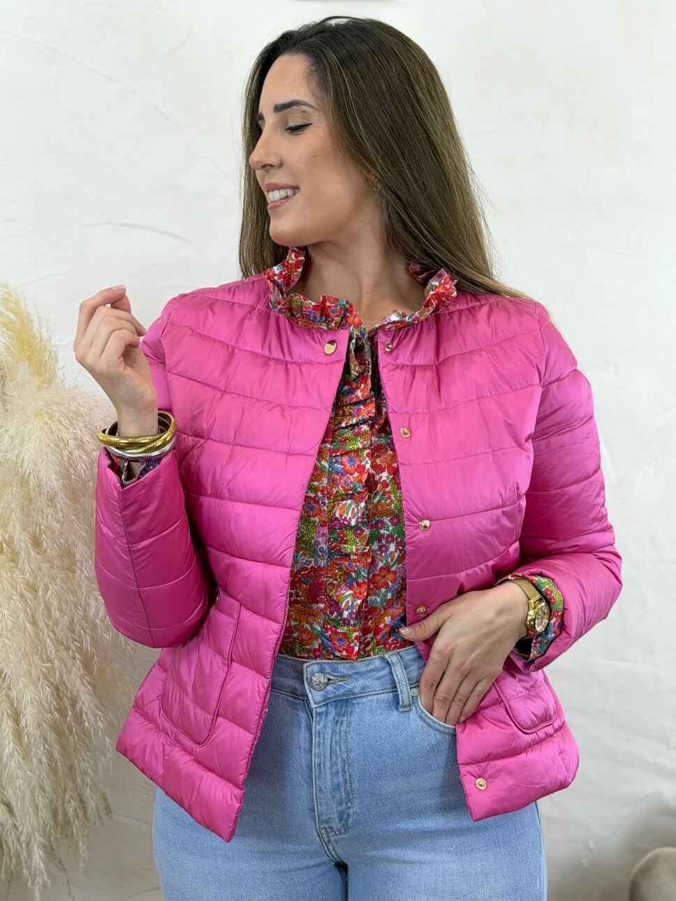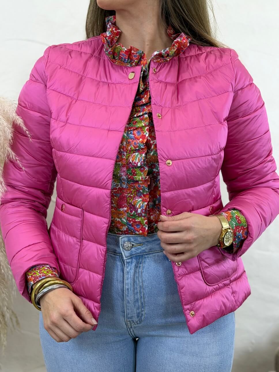 Plumi de entretiempo con cuello redondo, cierre con corchetes, bolsillos delanteros. Súper estilosa.