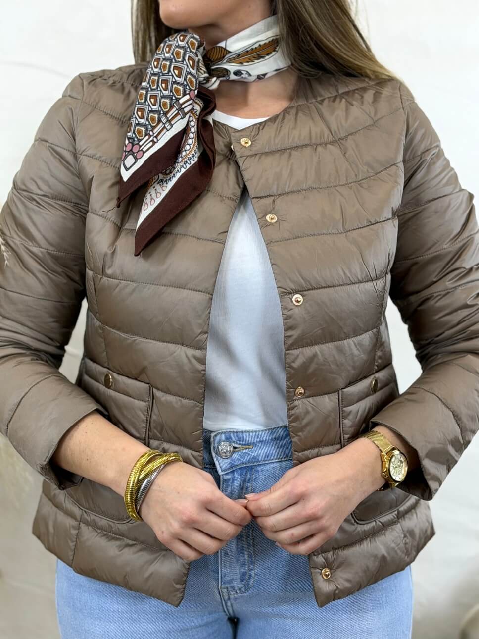 Plumi de entretiempo con cuello redondo, cierre con corchetes, bolsillos delanteros. Súper estilosa.