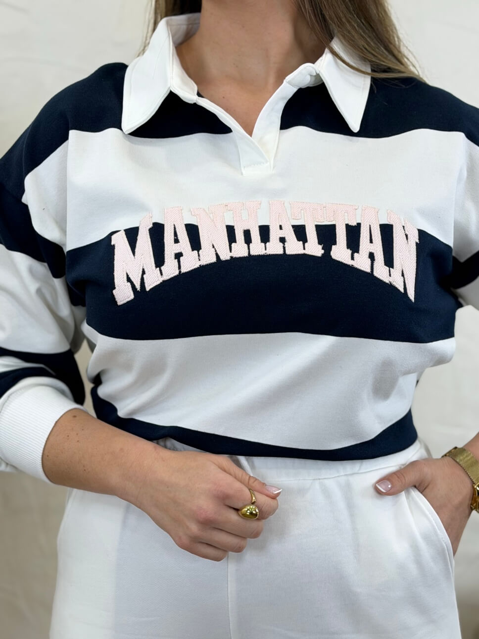 Sudadera de rayas con cuello polo y letras bordadas en la parte delantera.