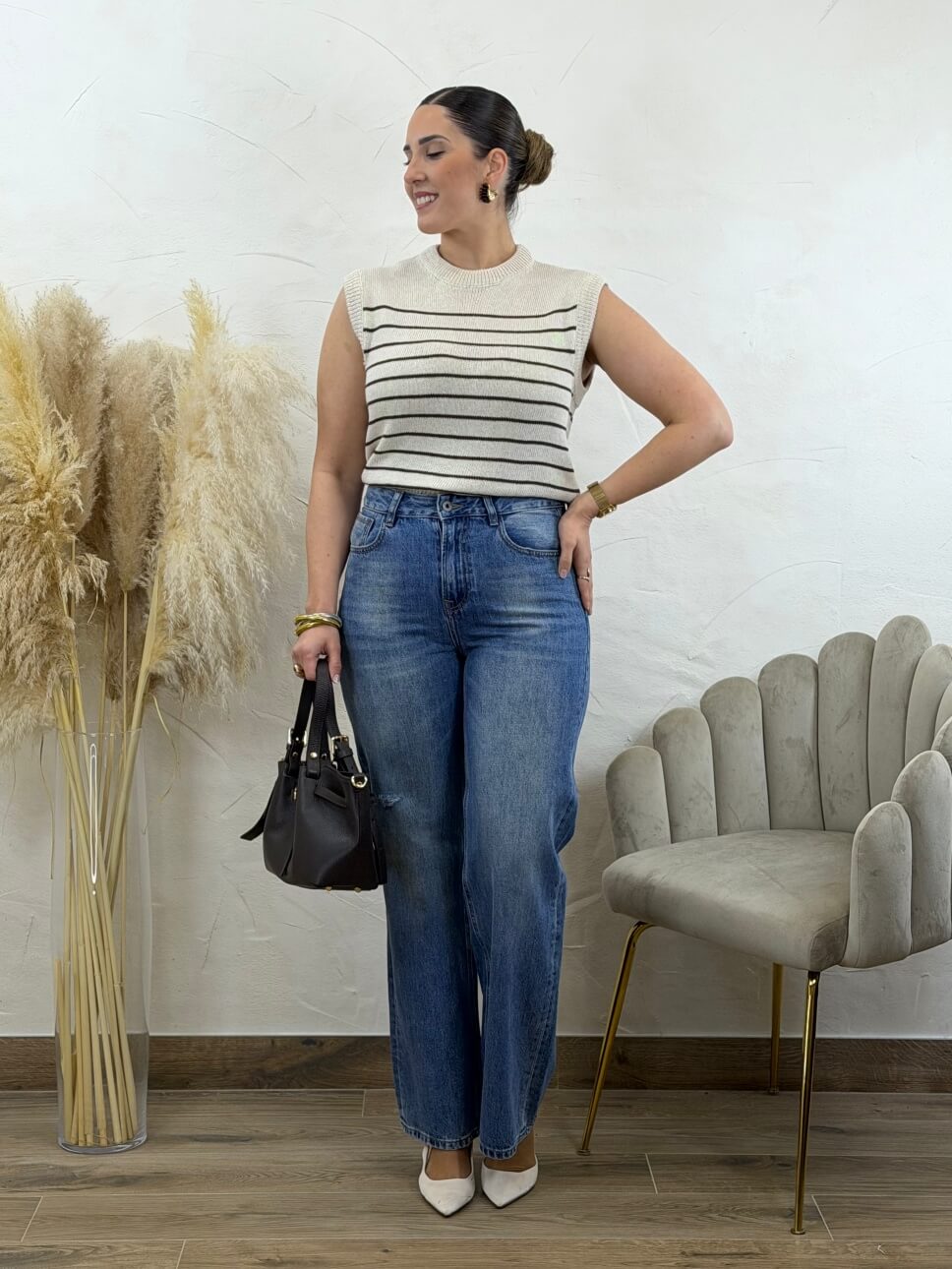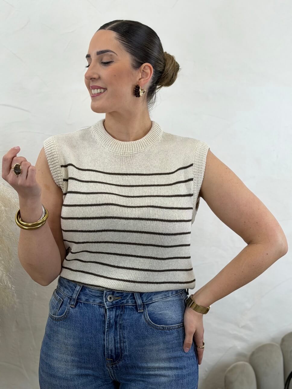 Top de hilo con estampado de rayas, desmangado y cuello redondo cerrado.
