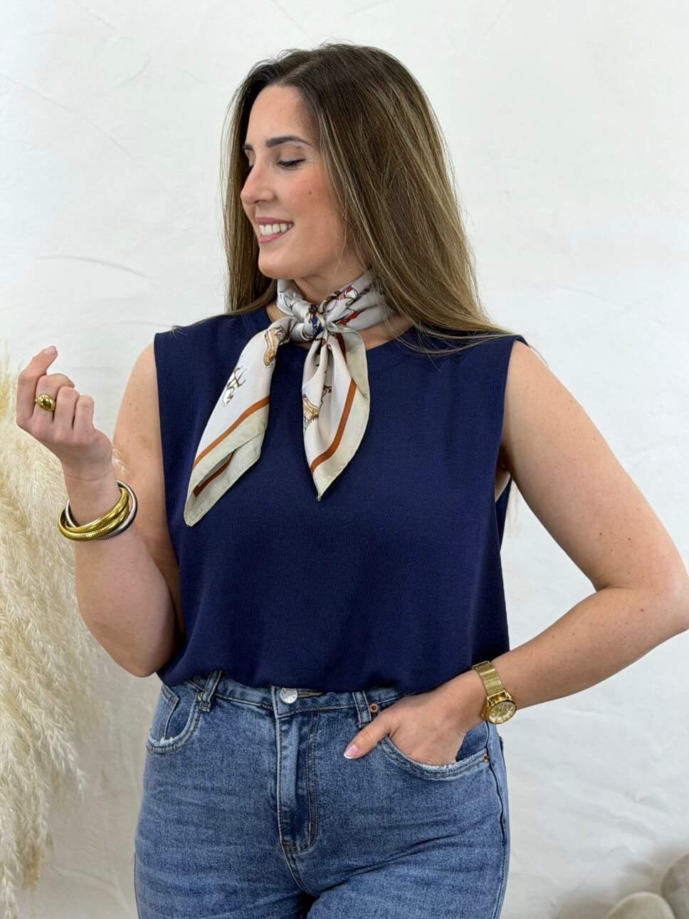 Top de punto fino desmangado y  abullonado en la parte baja con goma interior.