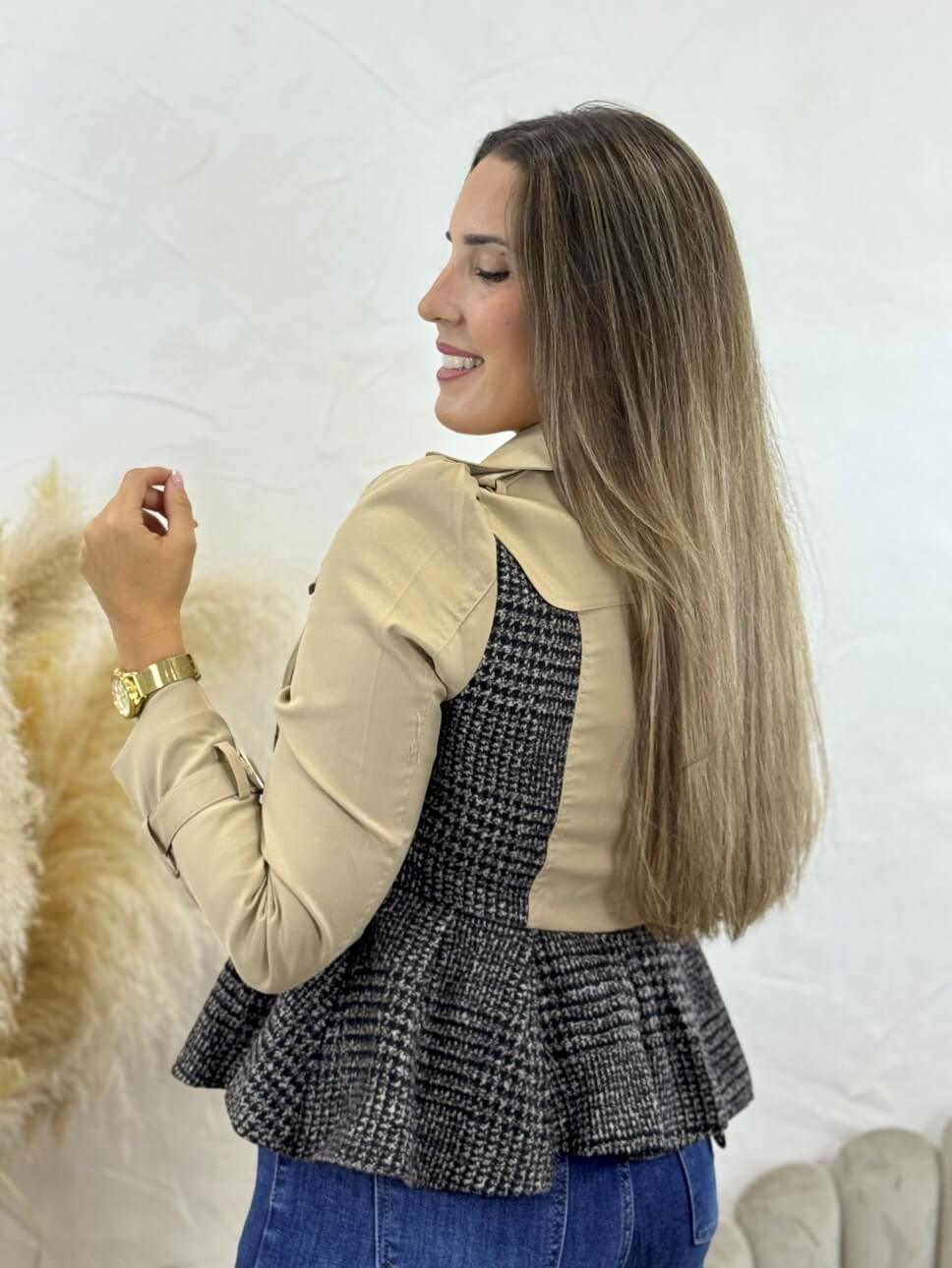 Chaqueta cruzada estilo gabardina corta combinada con estampado pata de gallo, cierre abotonado, correas en los puños del mismo tejido para ajustar, detalle de correa en los hombros.
