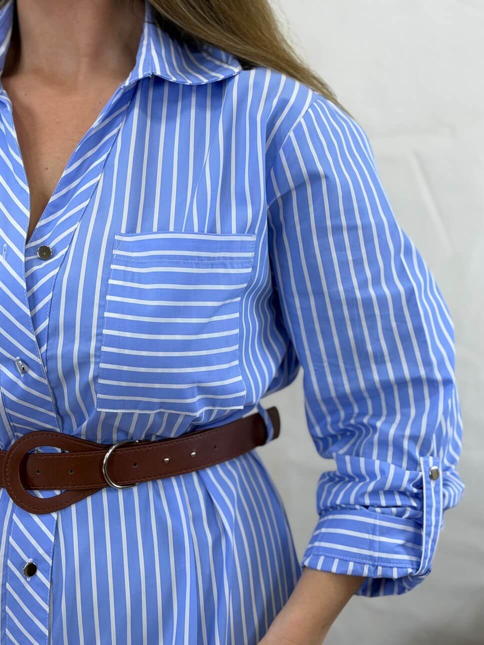 Vestido abotonado, estampado de rayas verticales, cuello camisero, tiras ajustables en las mangas con botón. Cinturón incluido.